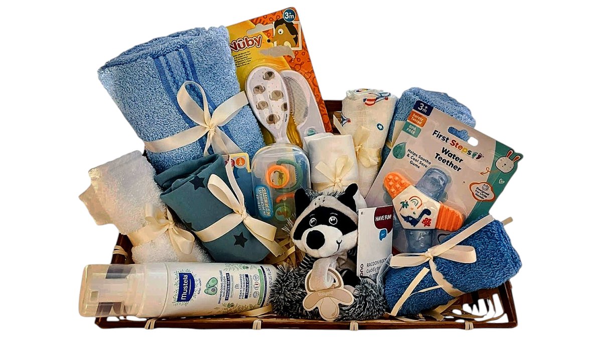 A soothing and practical set for bath time and baby care, wrapped in calming tones.