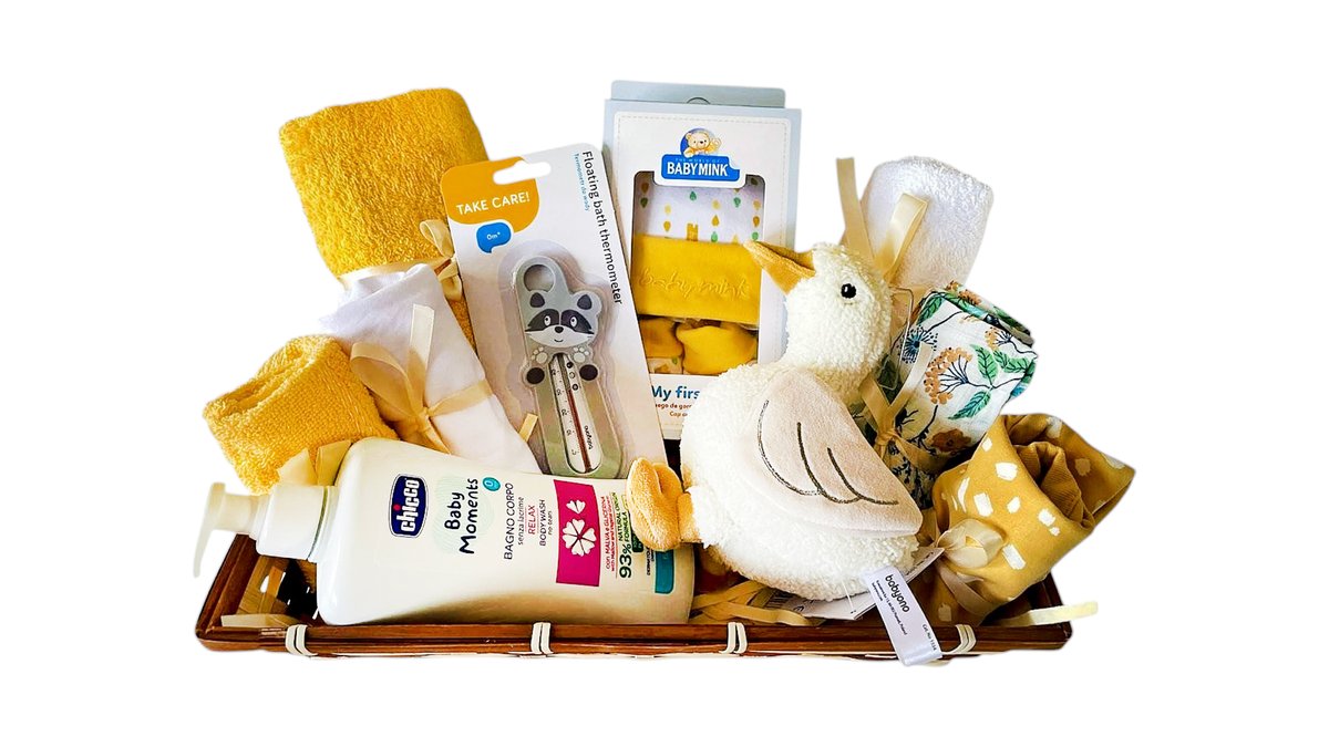 A soothing and practical set for bath time and baby care, wrapped in calming tones.