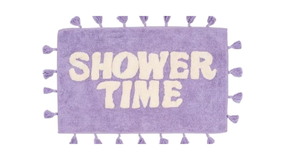 The purple "Shower Time" bath mat is made of 100% cotton with a non-slip backing. Complete your bathroom decor with a soft and fun mat!