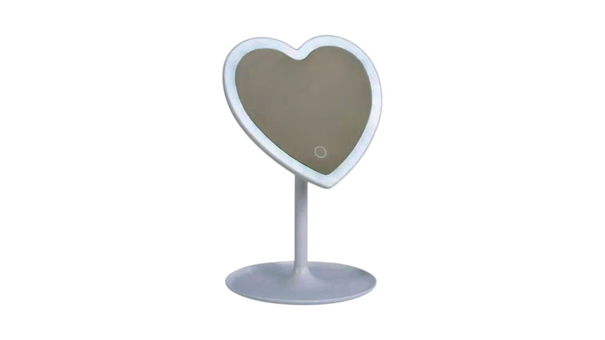 Our new heart-shaped mirror with LED lighting. It features a base that you can use to store jewelry, cosmetics, etc., and a touch button on the mirror to adjust the brightness.